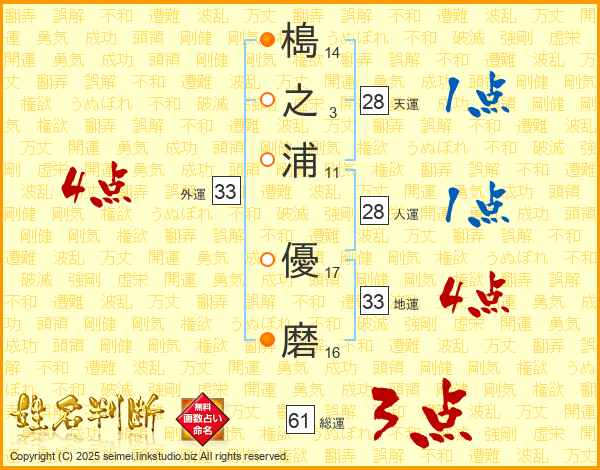 槝(14画)之(3画)浦(11画) 優(17画)磨(16画)