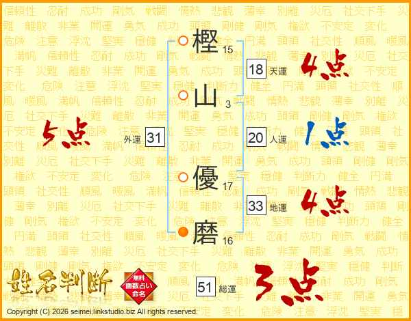 樫(15画)山(3画) 優(17画)磨(16画)