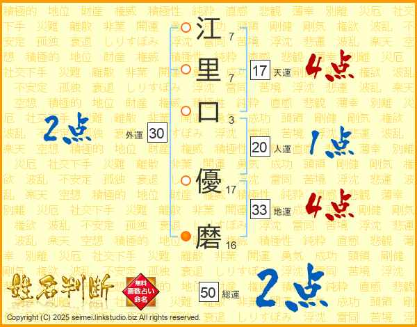 江(7画)里(7画)口(3画) 優(17画)磨(16画)