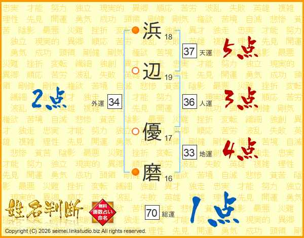 浜辺優磨さんの天運は37画の5点!