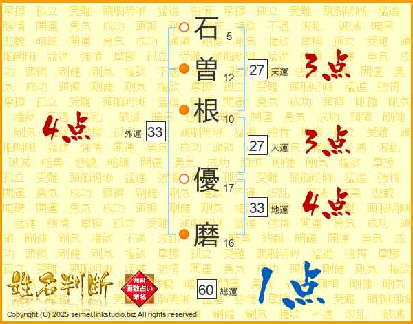 石(5画)曽(12画)根(10画) 優(17画)磨(16画)