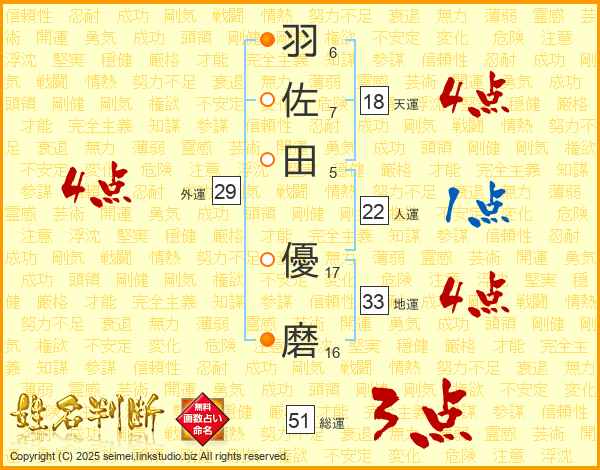 羽(6画)佐(7画)田(5画) 優(17画)磨(16画)
