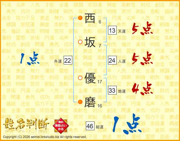 西(6画)坂(7画) 優(17画)磨(16画)