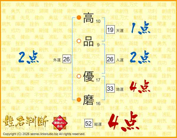 高品優磨さんの総運は52画の4点!