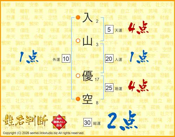 生活面を象徴する運勢です。外部から受ける影響力を表し、結婚運、家庭運や職場、環境への順応性を表します。総運から人運を引いた画数。姓や名が1文字の場合を除く。
