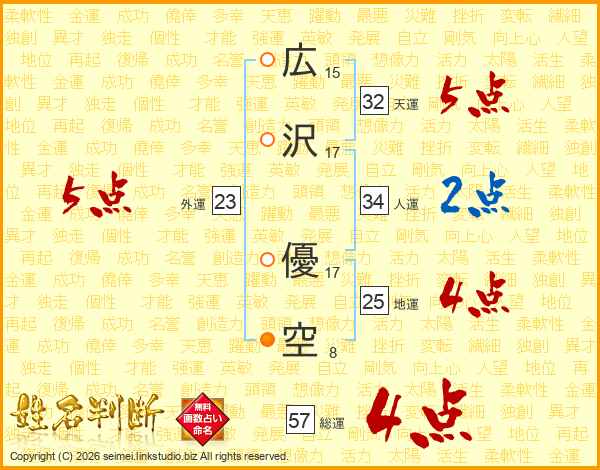 広(15画)沢(17画) 優(17画)空(8画)
