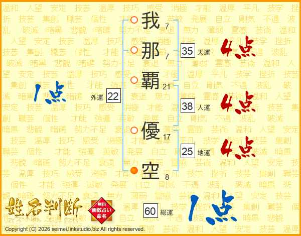 我(7画)那(7画)覇(21画) 優(17画)空(8画)
