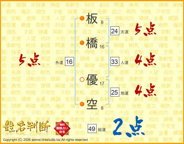 生活面を象徴する運勢です。外部から受ける影響力を表し、結婚運、家庭運や職場、環境への順応性を表します。総運から人運を引いた画数。姓や名が1文字の場合を除く。