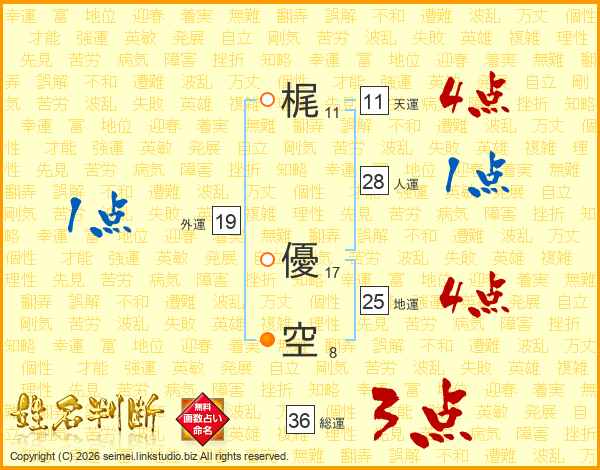 生活面を象徴する運勢です。外部から受ける影響力を表し、結婚運、家庭運や職場、環境への順応性を表します。総運から人運を引いた画数。姓や名が1文字の場合を除く。