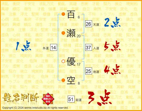 百瀬優空さんの人運は37画の5点!