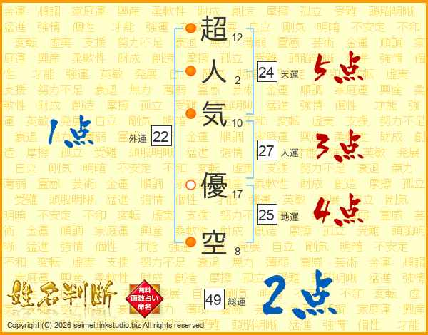 超(12画)人(2画)気(10画) 優(17画)空(8画)