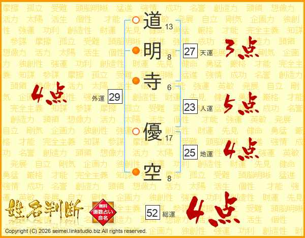 道明寺優空さんの総運は52画の4点!