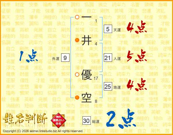生活面を象徴する運勢です。外部から受ける影響力を表し、結婚運、家庭運や職場、環境への順応性を表します。総運から人運を引いた画数。姓や名が1文字の場合を除く。
