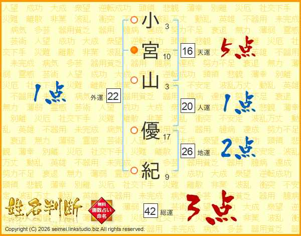 小(3画)宮(10画)山(3画) 優(17画)紀(9画)