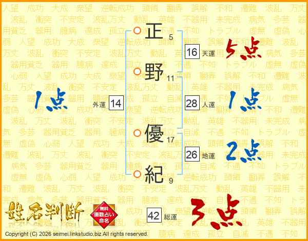 正(5画)野(11画) 優(17画)紀(9画)