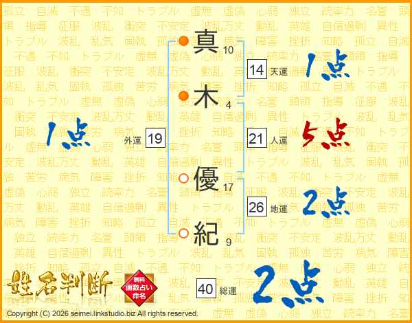 真(10画)木(4画) 優(17画)紀(9画)