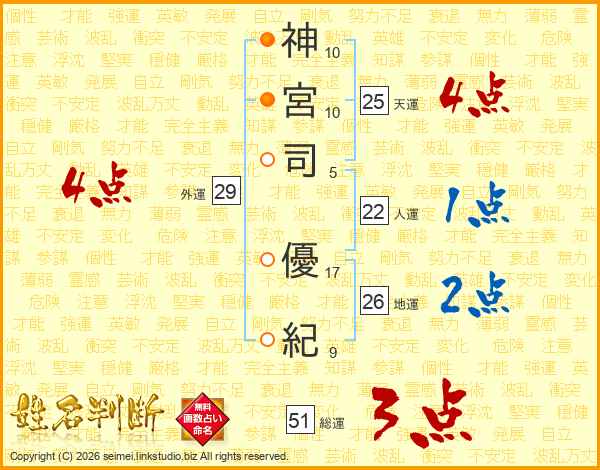神(10画)宮(10画)司(5画) 優(17画)紀(9画)