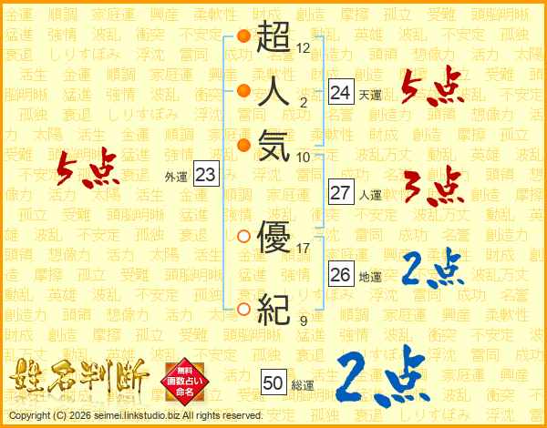 超(12画)人(2画)気(10画) 優(17画)紀(9画)