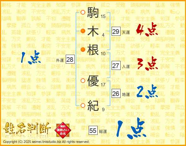 駒(15画)木(4画)根(10画) 優(17画)紀(9画)