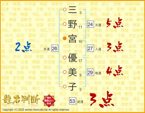 三(3画)野(11画)宮(10画) 優(17画)美(9画)子(3画)