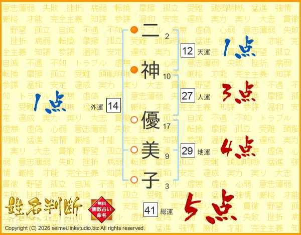 二(2画)神(10画) 優(17画)美(9画)子(3画)