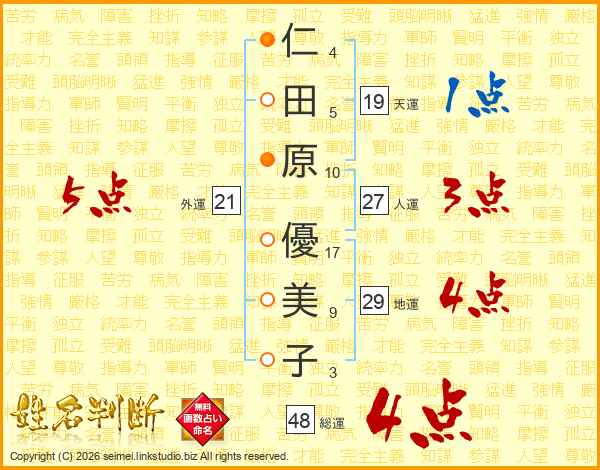 仁(4画)田(5画)原(10画) 優(17画)美(9画)子(3画)