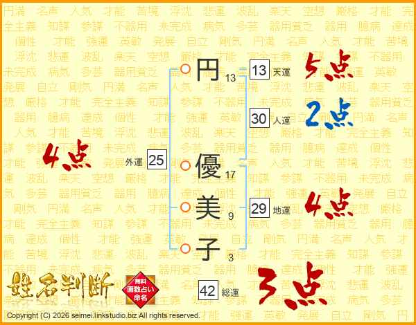 生活面を象徴する運勢です。外部から受ける影響力を表し、結婚運、家庭運や職場、環境への順応性を表します。総運から人運を引いた画数。姓や名が1文字の場合を除く。