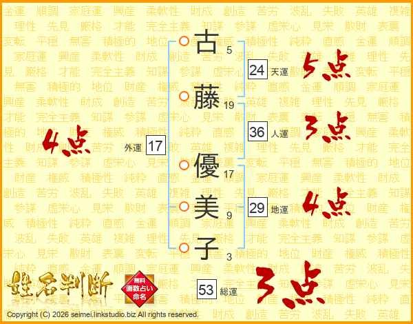 古(5画)藤(19画) 優(17画)美(9画)子(3画)