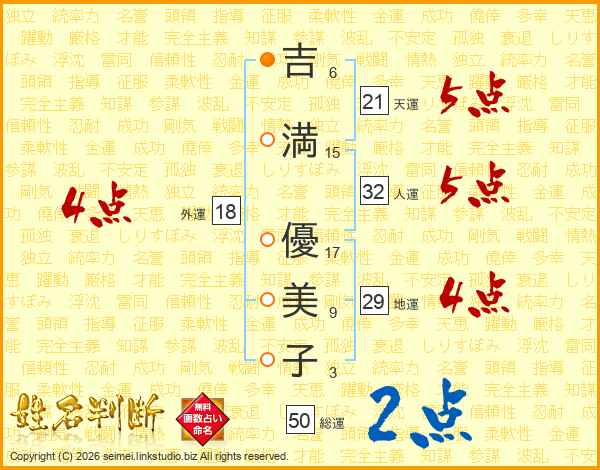 吉(6画)満(15画) 優(17画)美(9画)子(3画)