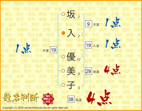 坂(7画)入(2画) 優(17画)美(9画)子(3画)
