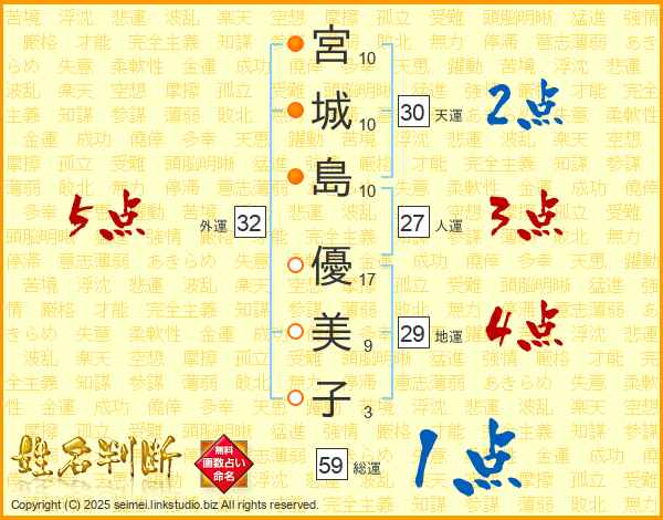 宮(10画)城(10画)島(10画) 優(17画)美(9画)子(3画)