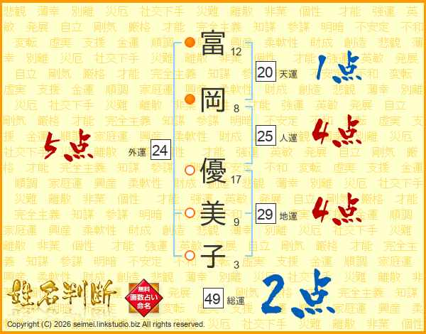 富(12画)岡(8画) 優(17画)美(9画)子(3画)