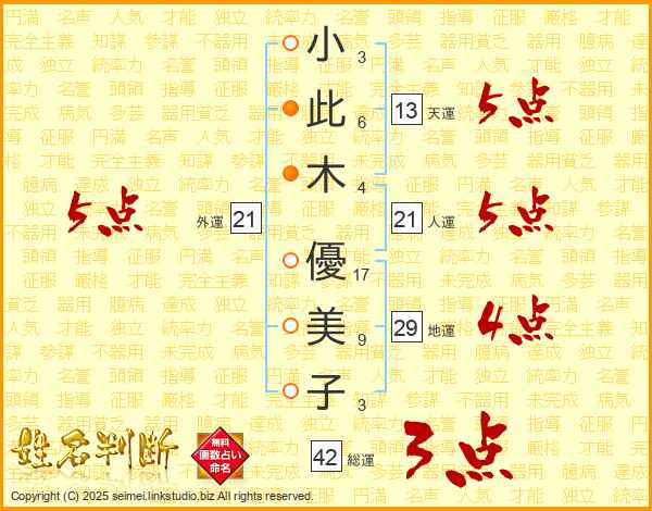 小(3画)此(6画)木(4画) 優(17画)美(9画)子(3画)