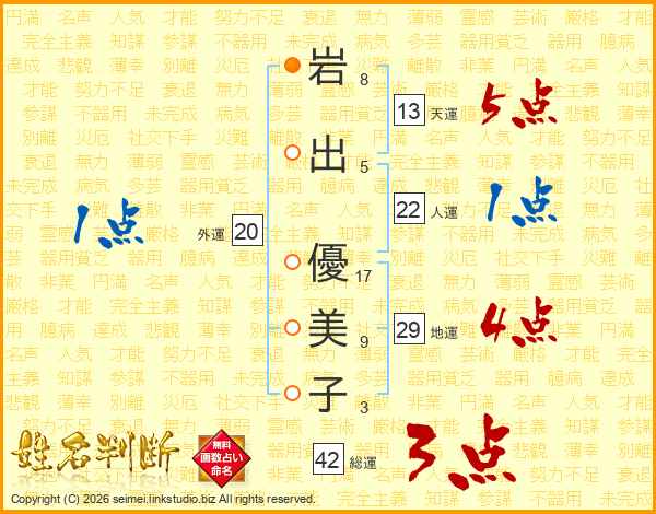 岩(8画)出(5画) 優(17画)美(9画)子(3画)