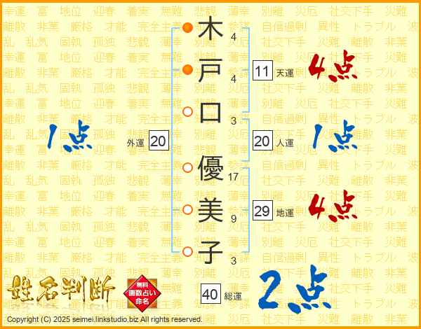 木(4画)戸(4画)口(3画) 優(17画)美(9画)子(3画)