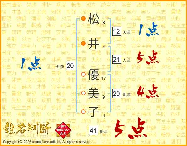 松井優美子さんの総運は41画の5点!