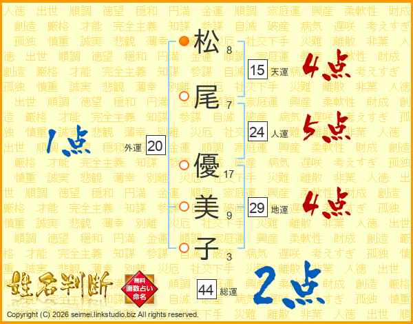 松(8画)尾(7画) 優(17画)美(9画)子(3画)