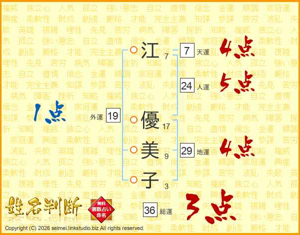 生活面を象徴する運勢です。外部から受ける影響力を表し、結婚運、家庭運や職場、環境への順応性を表します。総運から人運を引いた画数。姓や名が1文字の場合を除く。