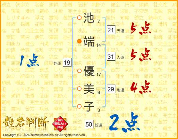 池(7画)端(14画) 優(17画)美(9画)子(3画)