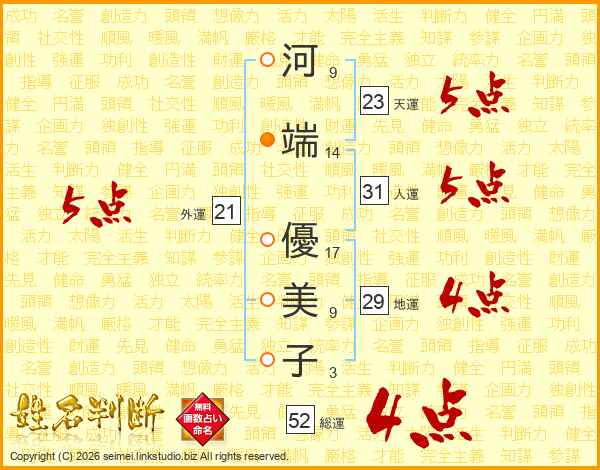 河(9画)端(14画) 優(17画)美(9画)子(3画)