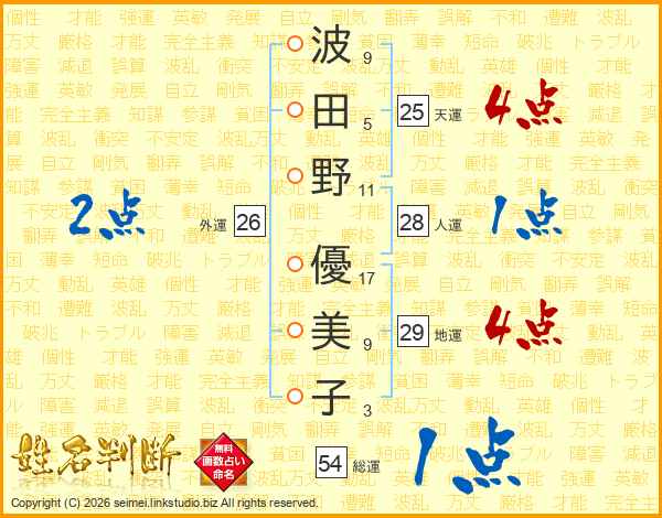 波(9画)田(5画)野(11画) 優(17画)美(9画)子(3画)