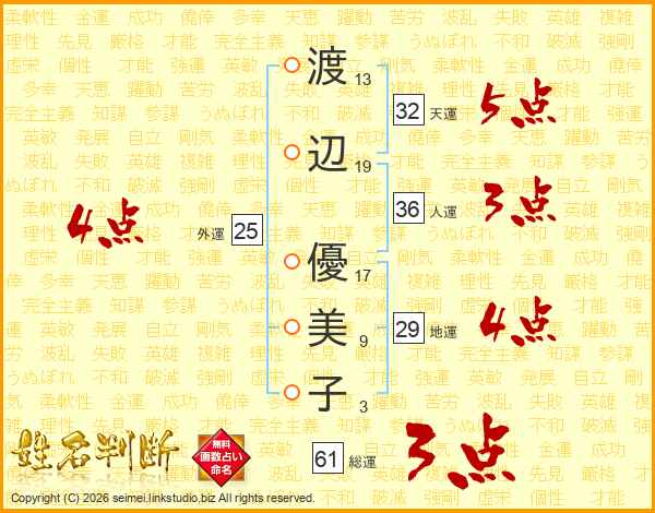 渡辺優美子さんの総運は61画の3点!