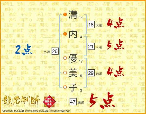 溝(14画)内(4画) 優(17画)美(9画)子(3画)