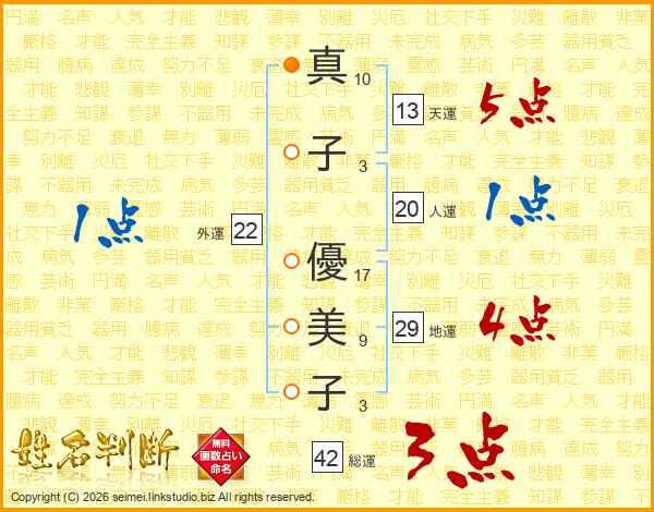 真(10画)子(3画) 優(17画)美(9画)子(3画)