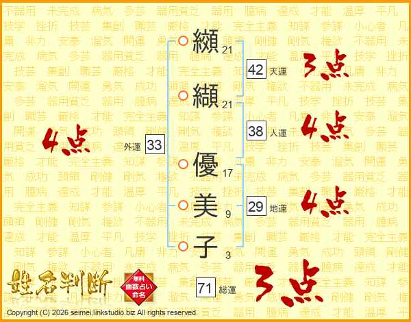 纐(21画)纈(21画) 優(17画)美(9画)子(3画)