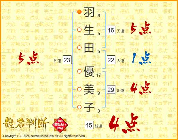 羽(6画)生(5画)田(5画) 優(17画)美(9画)子(3画)