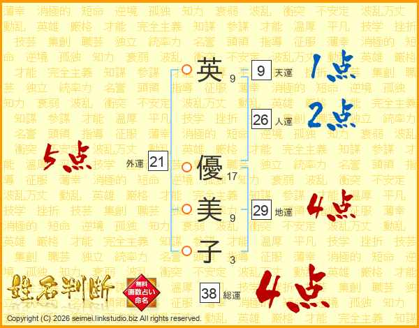 生活面を象徴する運勢です。外部から受ける影響力を表し、結婚運、家庭運や職場、環境への順応性を表します。総運から人運を引いた画数。姓や名が1文字の場合を除く。