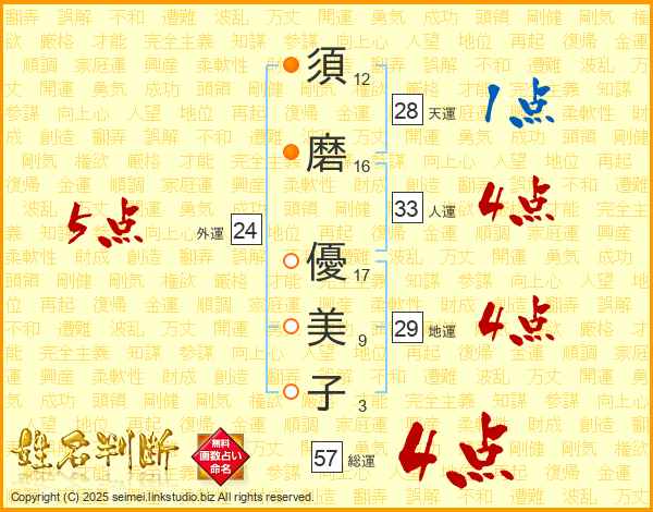 須(12画)磨(16画) 優(17画)美(9画)子(3画)