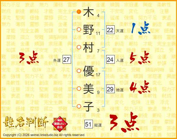 木(4画)野(11画)村(7画) 優(17画)美(9画)子(3画)