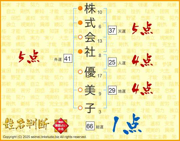 株(10画)式(6画)会(13画)社(8画) 優(17画)美(9画)子(3画)